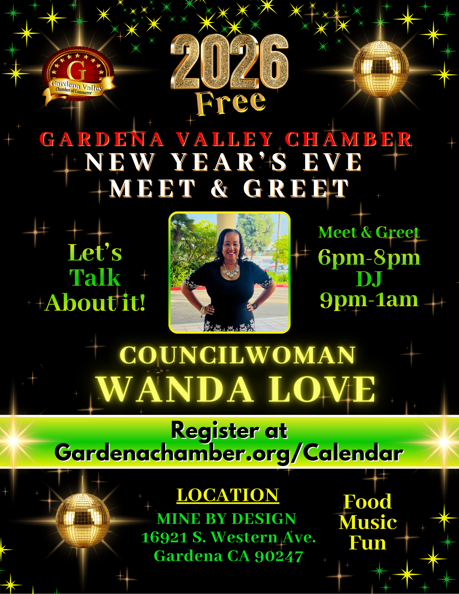 Ring in 2026 with us at the Gardena Valley Chamber of Commerce FREE New Year’s Eve Meet & Greet with Councilwoman Wanda Love!