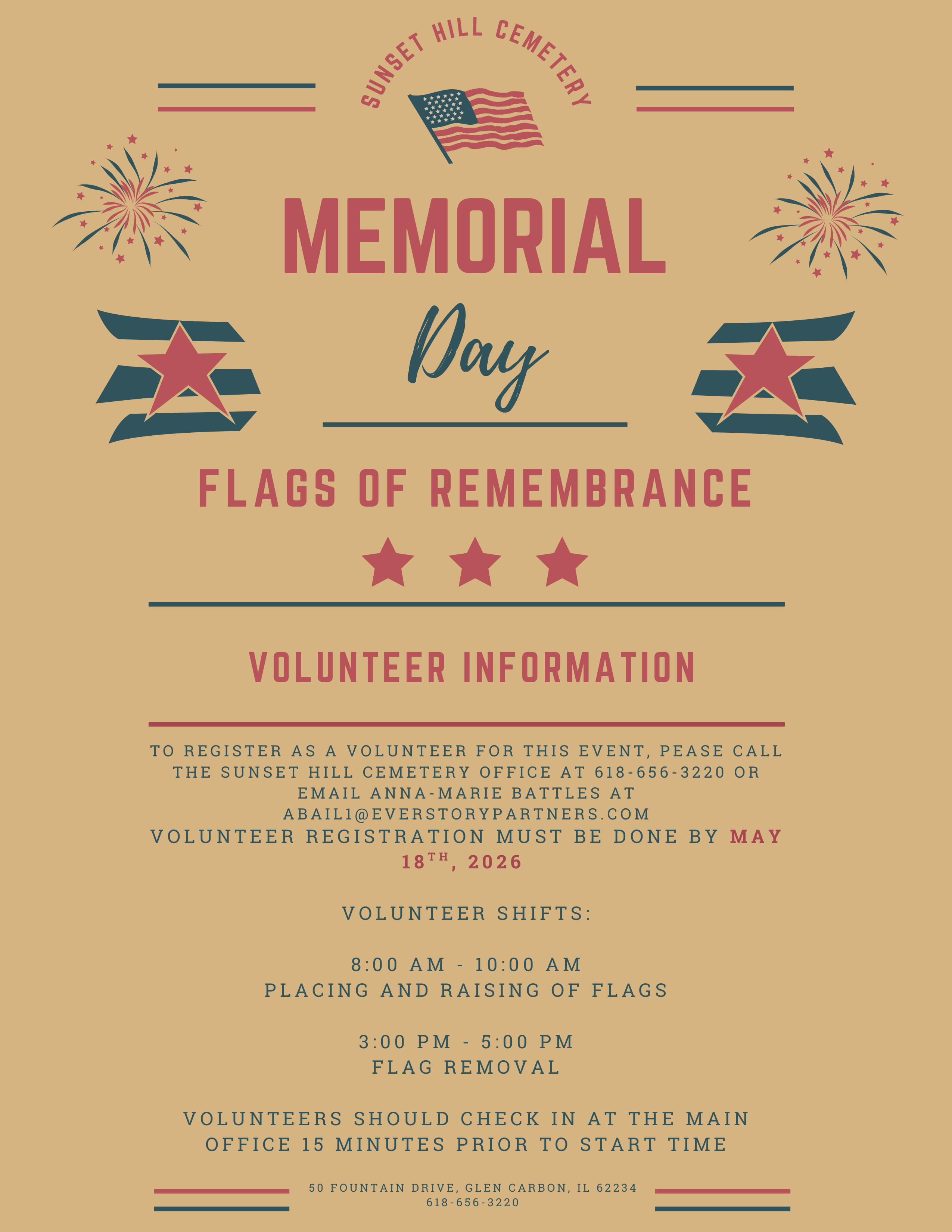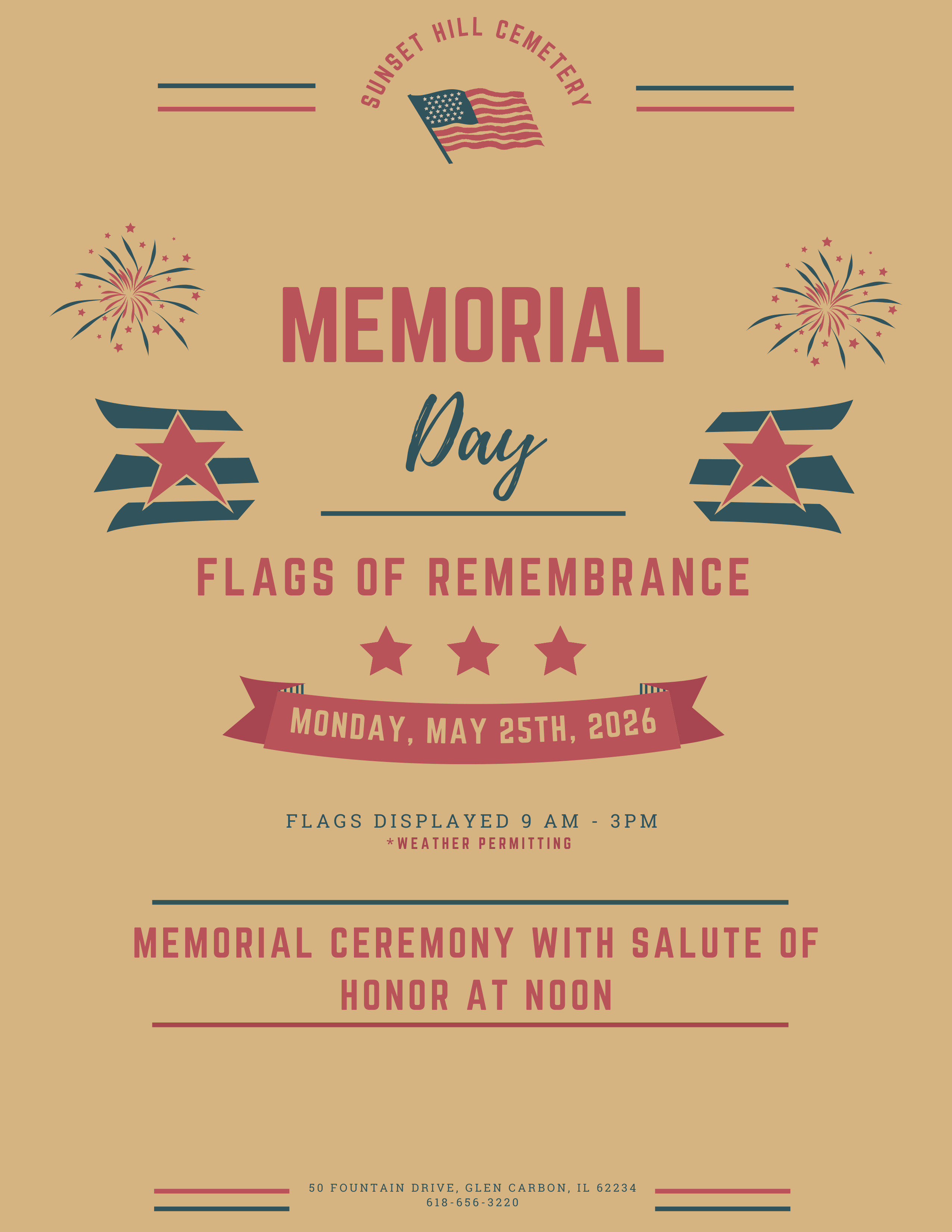 Sunset Hill Cemetery will be placing flags of remembrance on Memorial Day with a ceremony and salute of honor at 12PM. All are welcome to attend.
